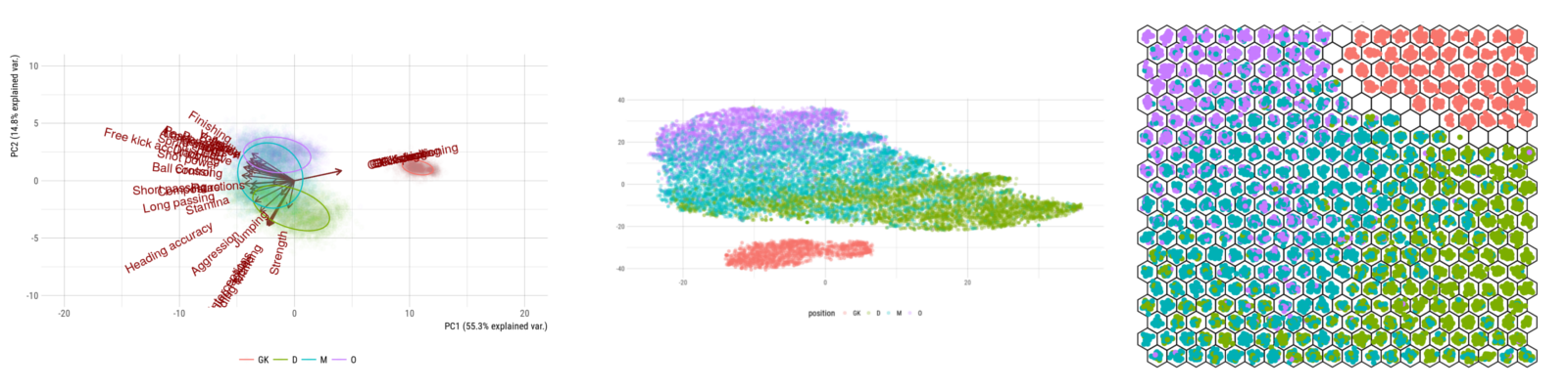 As a quick reminder, these were the figures we obtained using PCA, t-SNE and a self organizing map.