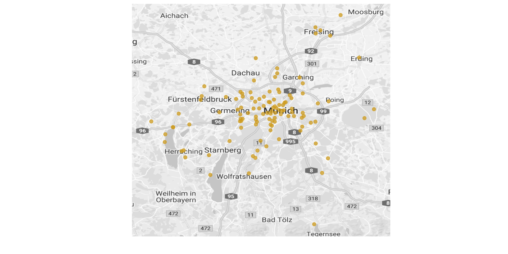 Munich is, among other things of course, famous for its beergardens. If you are not German enough to know what a beergarden is, well, it is simply an outdoor area in which beer and some local food are served. The concept in fact originated in Munich, where you can find an enormous amount of them. I found this page, which lists 114 in and around Munich! I scraped their list and added Longitude/Latitude as well as the brewery that provides the beer. You can find the data as a csv file on github.