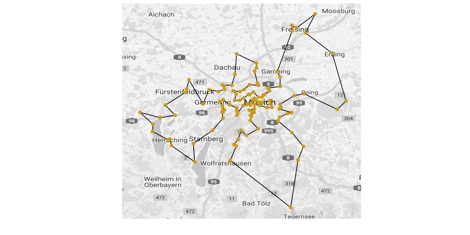More than 400km (240 miles) is certainly not something that can be done on a single day. We reduce the problem now a bit and just look at the beergardens that are not further than 15km (9.32 miles) away from the Marienplatz.