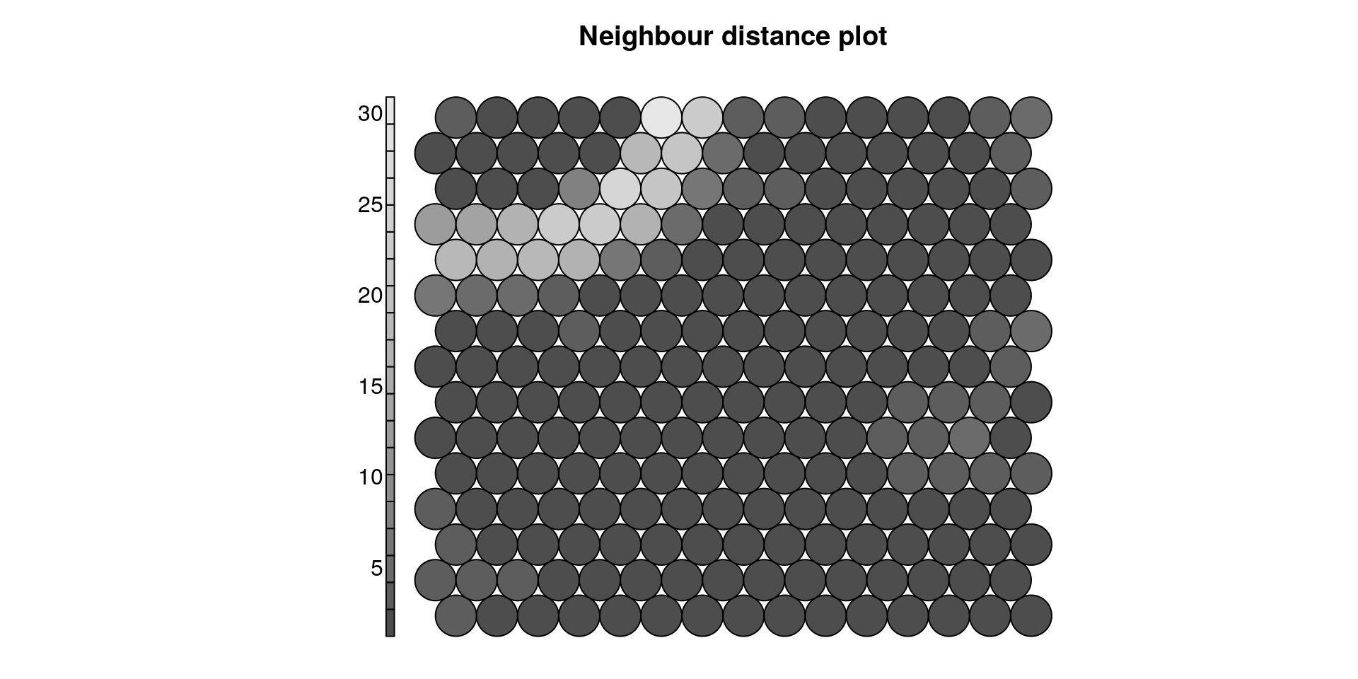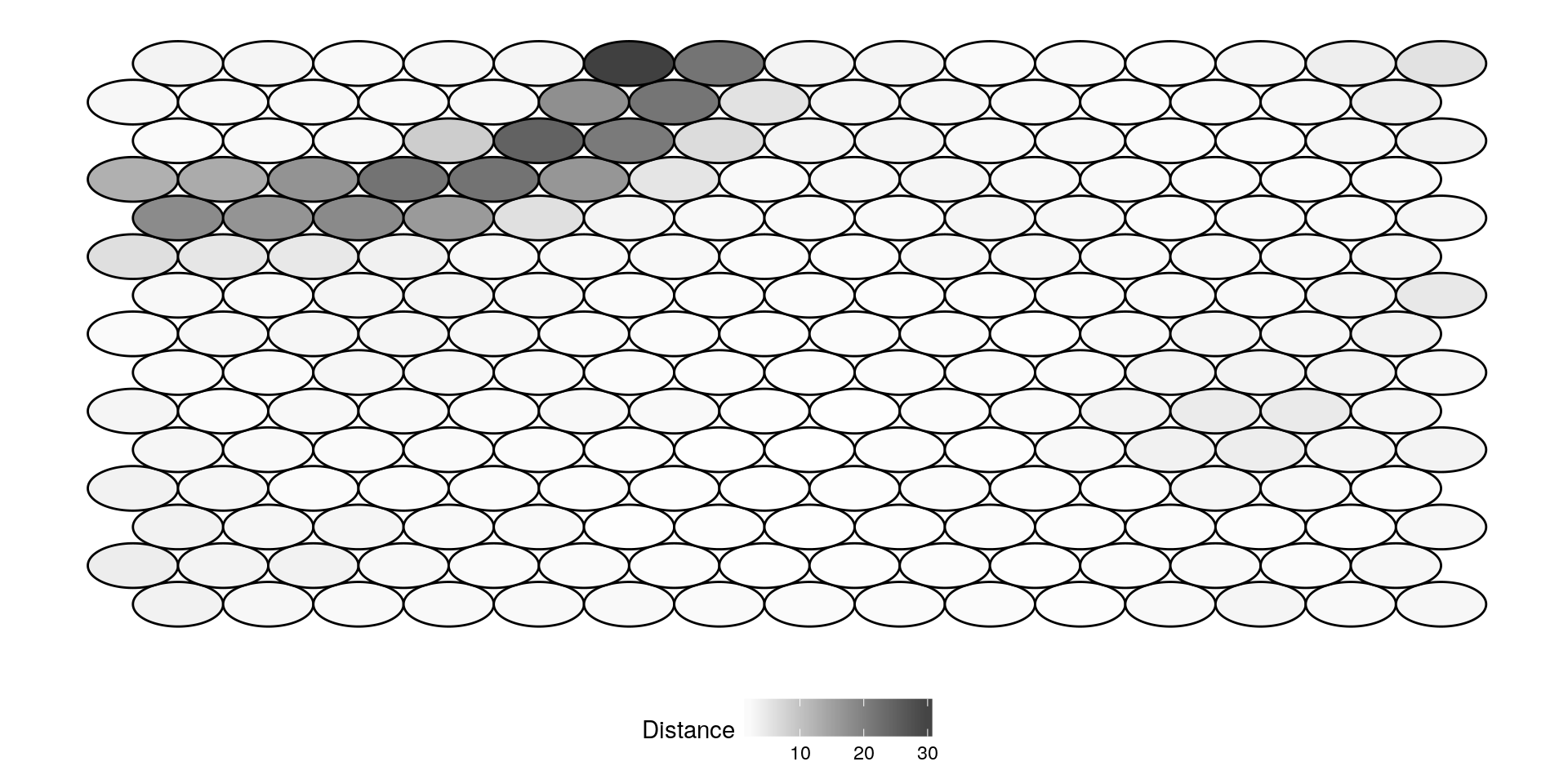 som_grid <- som_grid %>% mutate(dist=neigh.dists)This very much the same code as used in the package.