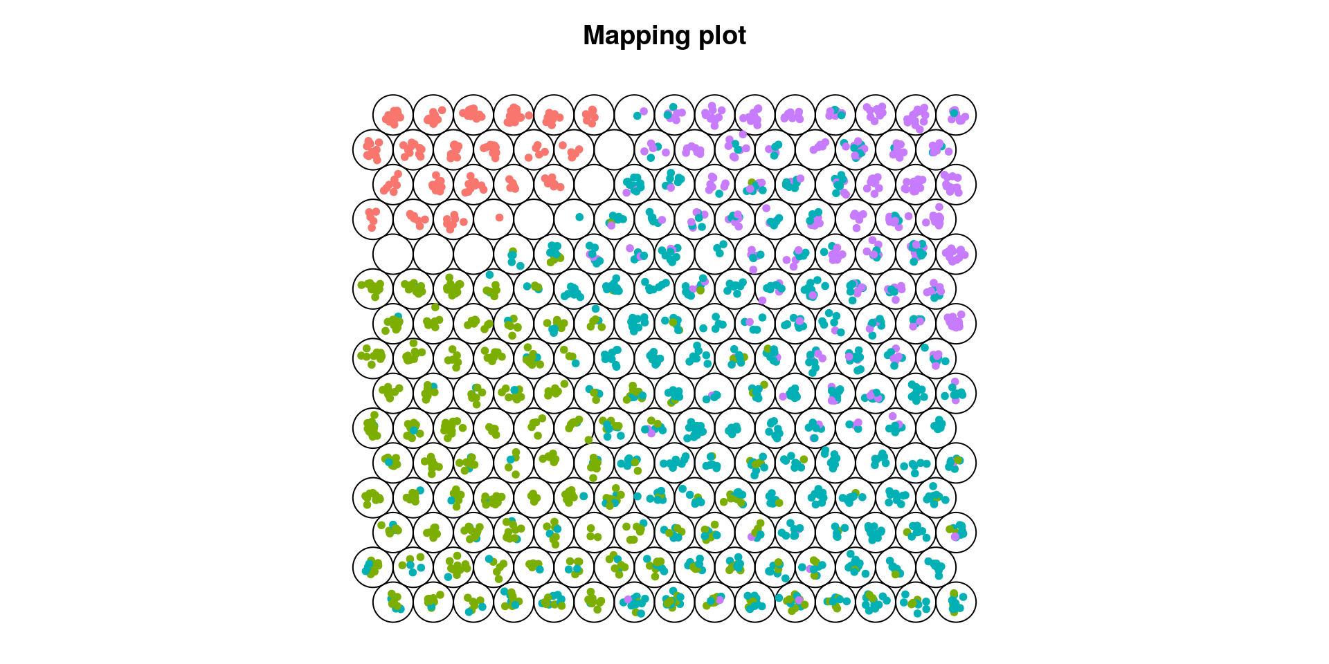 The code below produces the mapping plot with the kohonen package. If you forgot what that was, take a peak here.