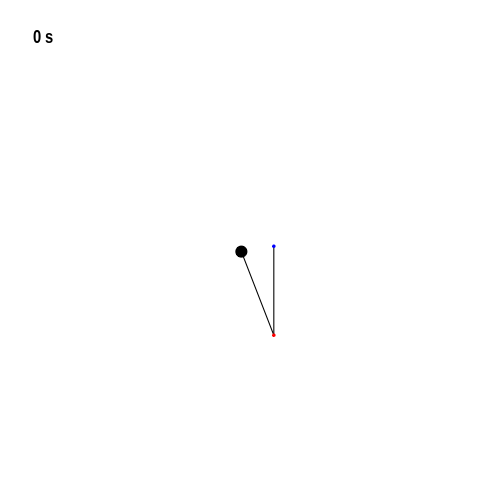 df <- tibble(t=sol[,1],x1,y1,x2,y2,group=1)The final data frame contains the exact position of the pendulums for each time step. Animating the pendulums is straightforward with the package gganimate.