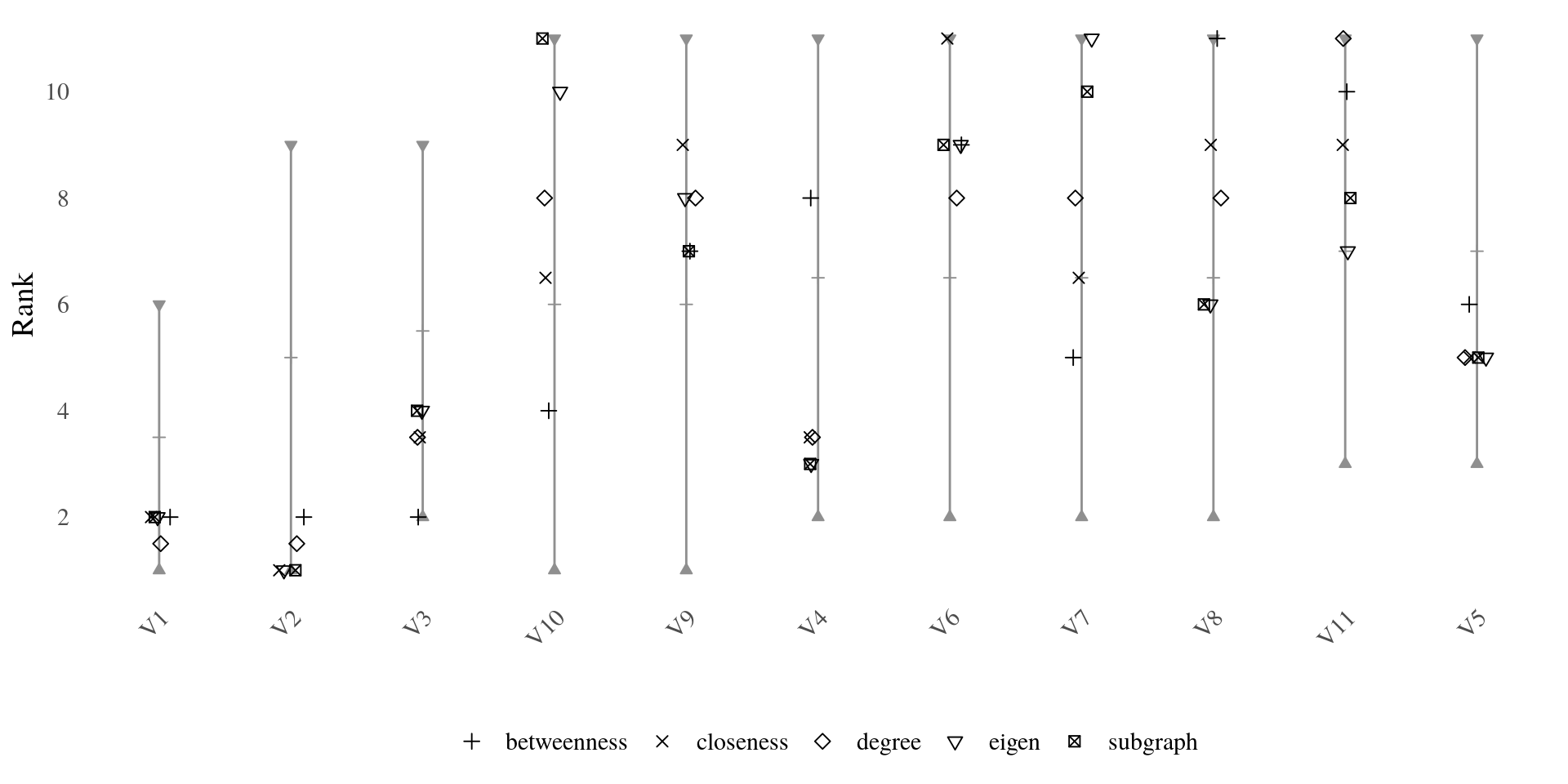 The rank intervals are extremely big for this network. Node 10, for instance can take any possible rank. The most constraint interval is that of node 1, containing 6 possible ranks. The rank intervals can be interpreted as a sort of confidence interval for centrality. The larger the interval, the less explanatory power a single index may have Again, consider Node 10. It is the most central node according to subgraph centrality, but ranks very low in betweenness.