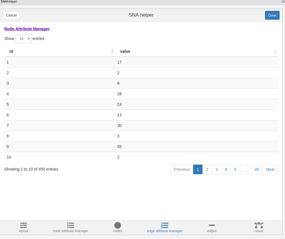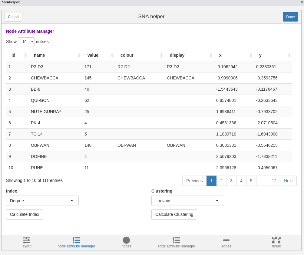 The Node Attribute Manager shows all existing node attributes in a sortable table. In addition, you can calculate some new ones (centrality and clustering).