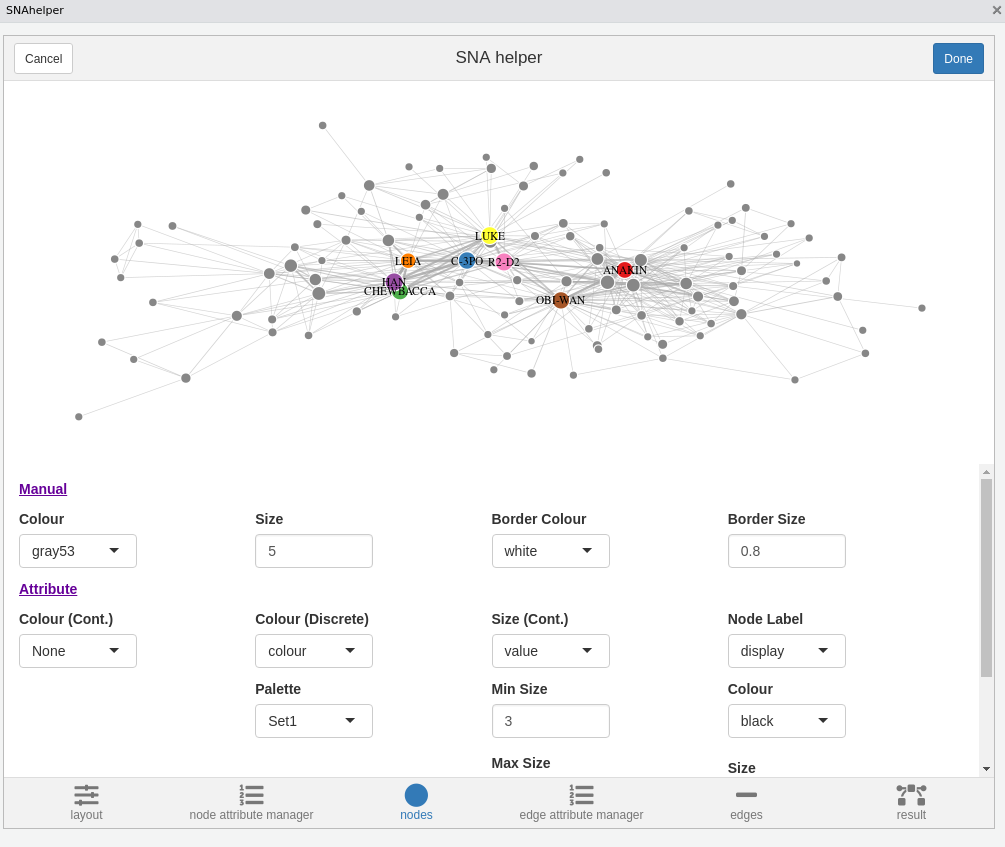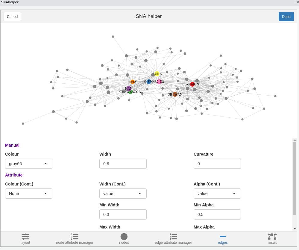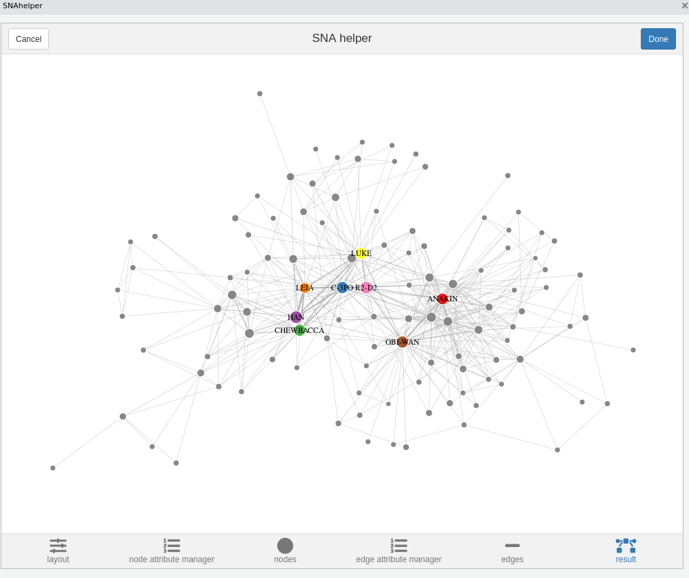 The result tab shows the network in its full size. If you are satisfied with the results, hit the Done button and the R code to produce the plot is automatically inserted in your script.