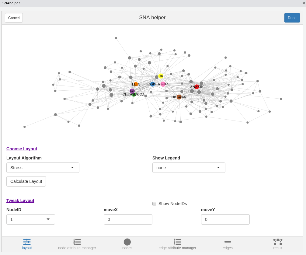 The layout tab allows you to choose from all implemented algorithms in igraph and the stress based layout from smglr, which is the default and recommended choice. See this blog post for an explanation. In the tweak section you can move individual nodes around. The implementation is still very crude, so don’t expect miracles from that. The layout is saved as node attributes x and y.