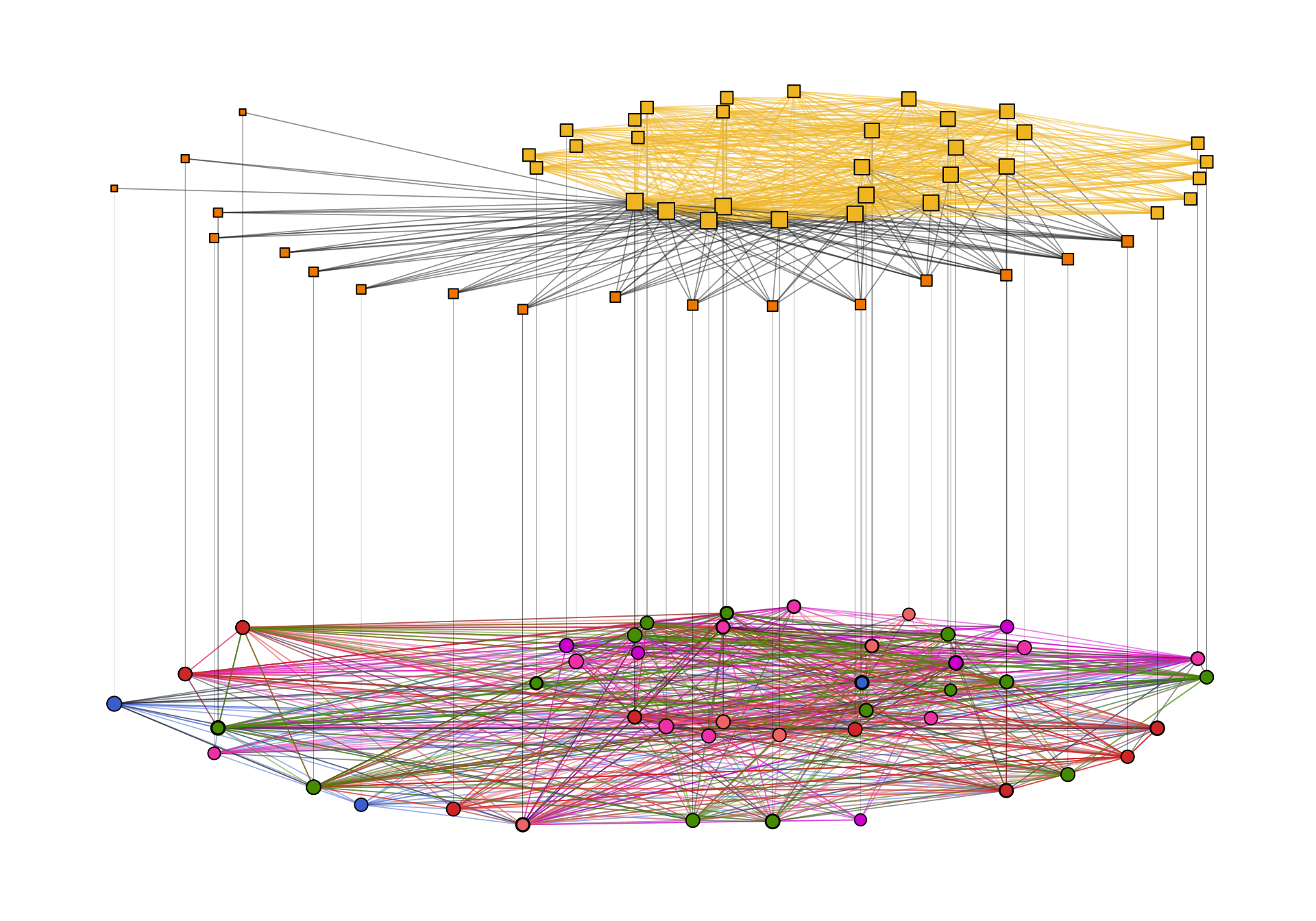 A multilevel network consists of two (or more) levels with different node sets and intra-level ties. For instance, one level could be scientists and their collaborative ties and the second level are labs and ties among them, and inter-level edges are the affiliations of scientists and labs.